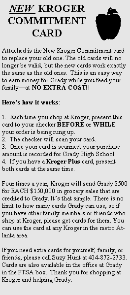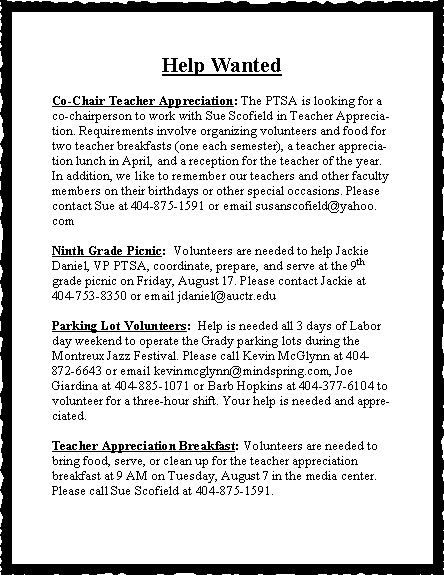 This year the PTSA has set a much more ambitious goal, and we need your help to reach it. We are raising parking fees to $10.00 for most events at Piedmont Park, and we need volunteers to collect fees and direct cars in the three lots around Grady. Please volunteer for a two- or three-hour shift. Students get community service credit, and parents have a great opportunity to be involved in their students' school. Upcoming events include the following: