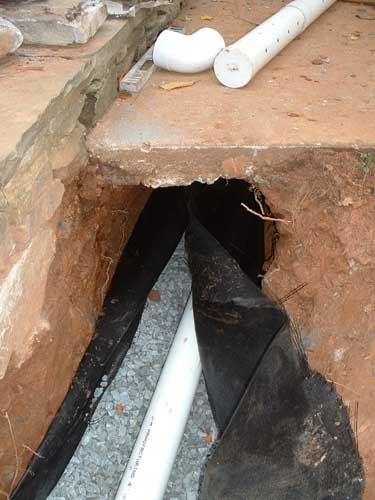The foundation drain: ditch, fabric, gravel, pipe. Goes right under the walk too.